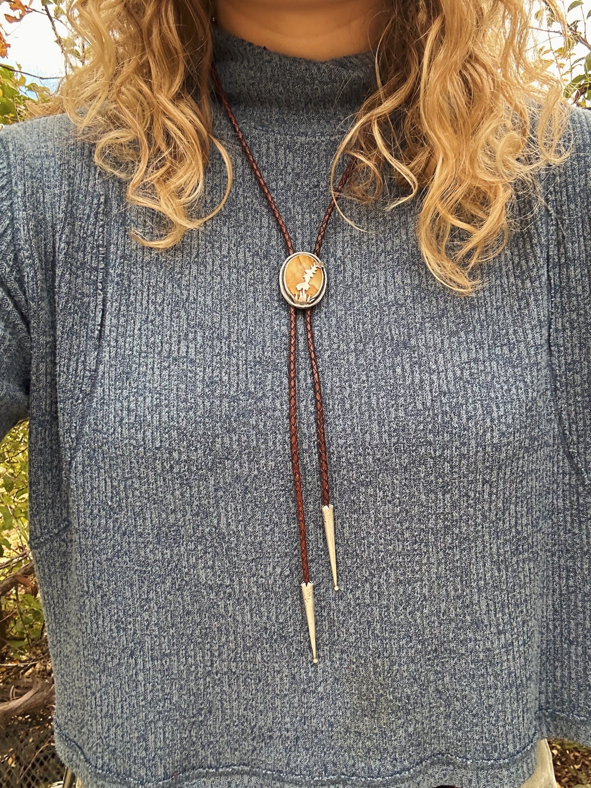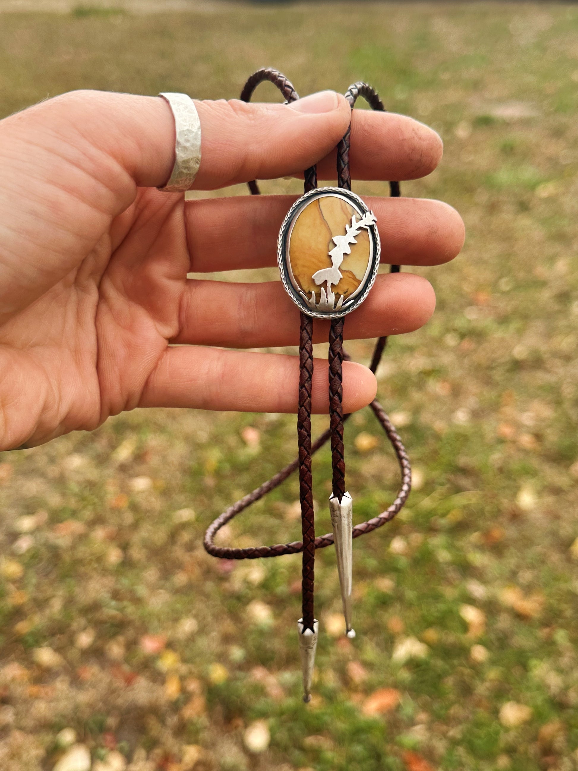 This sterling desert-inspired bolo tie features a piece of picture jasper that makes me think of climbing in all my favorite places - Red Rock, J-tree, Zion. A cholla textured wire border and a hand-sawed blooming yucca hug the beautiful sandy neutral hues of the stone. Dress it up for your next special occasion or wear it casual to add some flare to your fit!