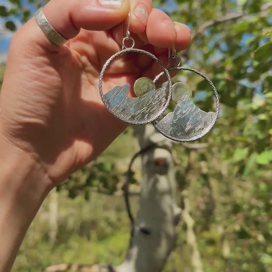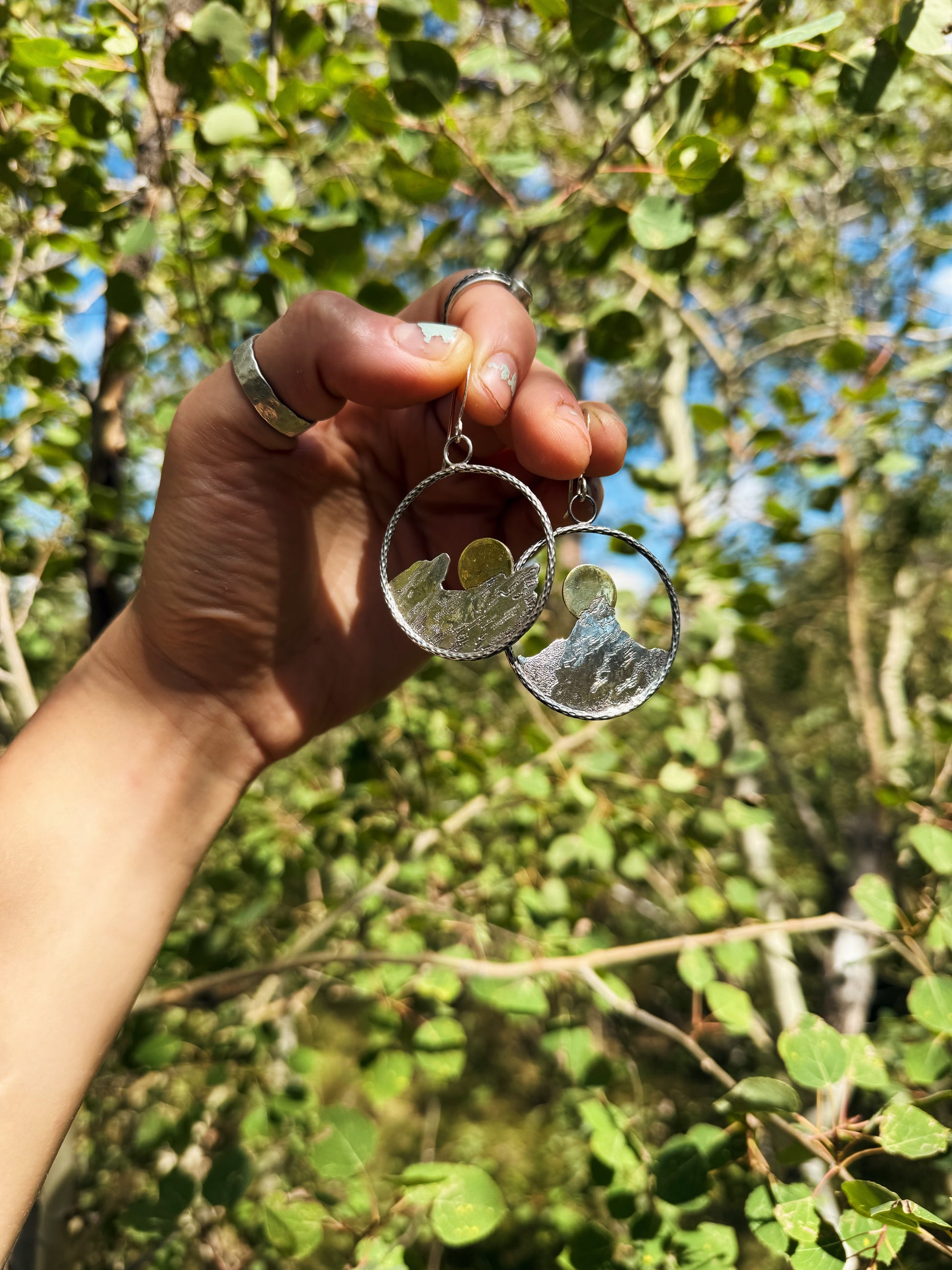 These hoops feature the classic view of the flatirons in Boulder, Colorado in engraved sterling and a sun on the horizon in brass, with a cholla textured wire border to accent it all. Wear them while you roam and romp!