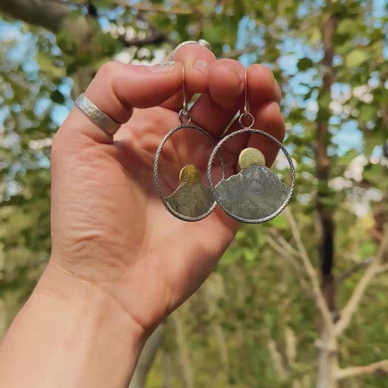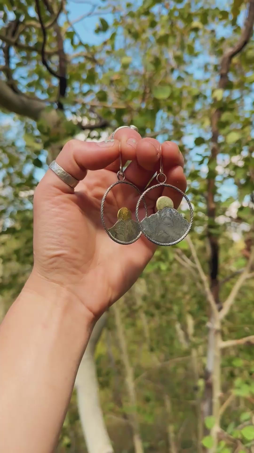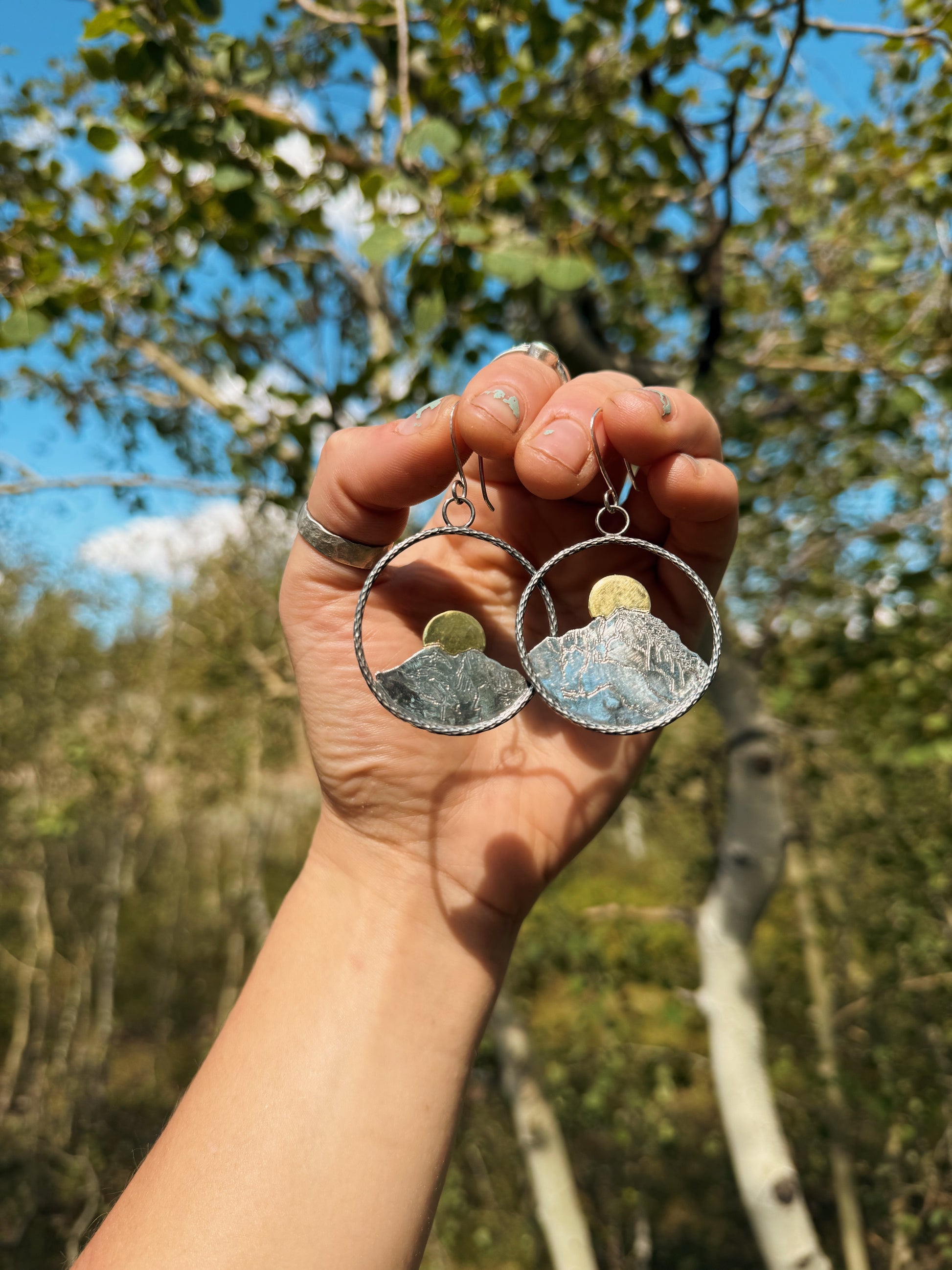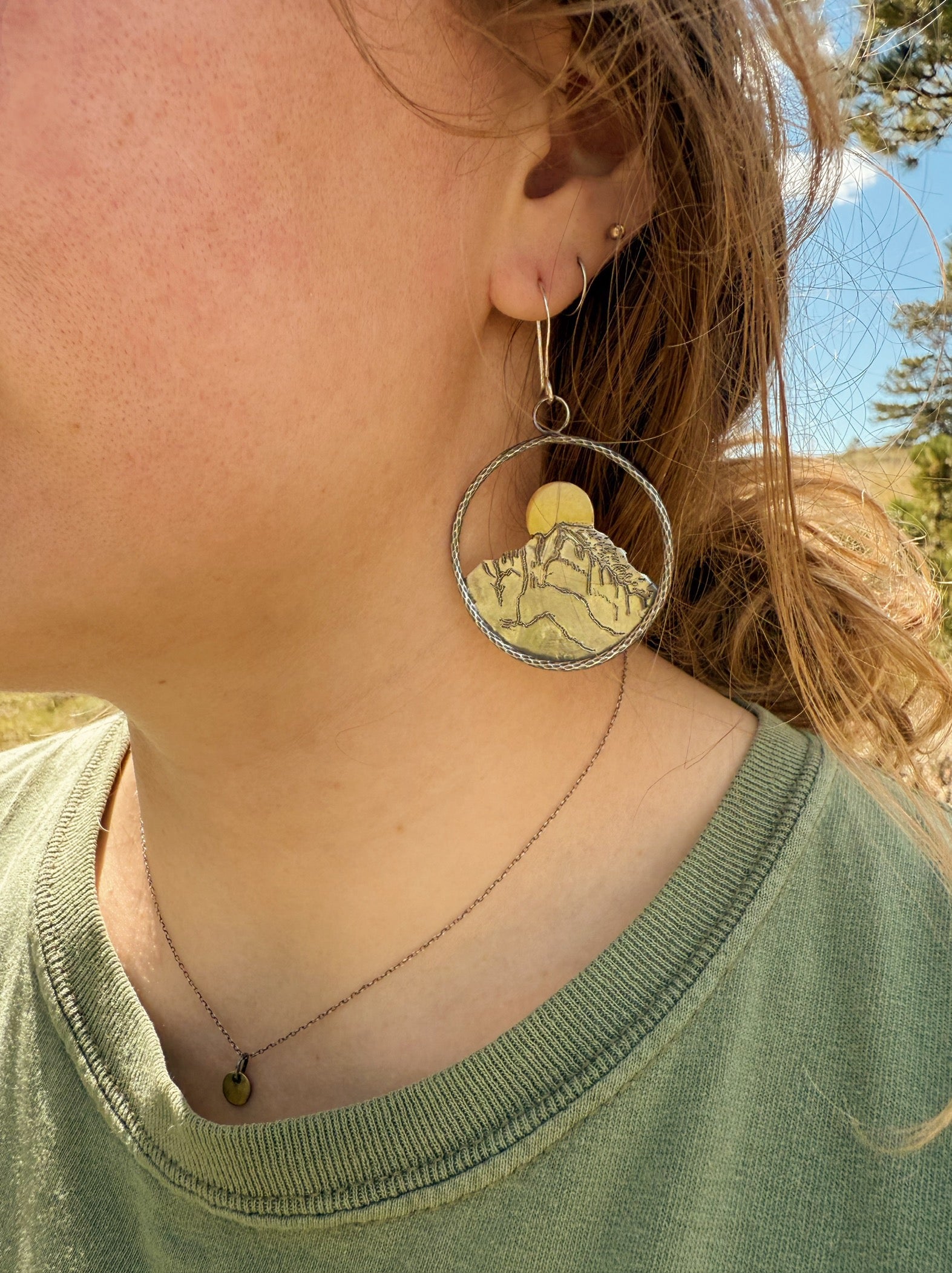 These hoops feature the grand and looming peaks of Rocky Mountain, Longs and Meeker. With engraved sterling and a sun on the horizon in brass, with a cholla textured wire border to accent it all, these hoops are made especially for the 14er lovers and diamond seekers.